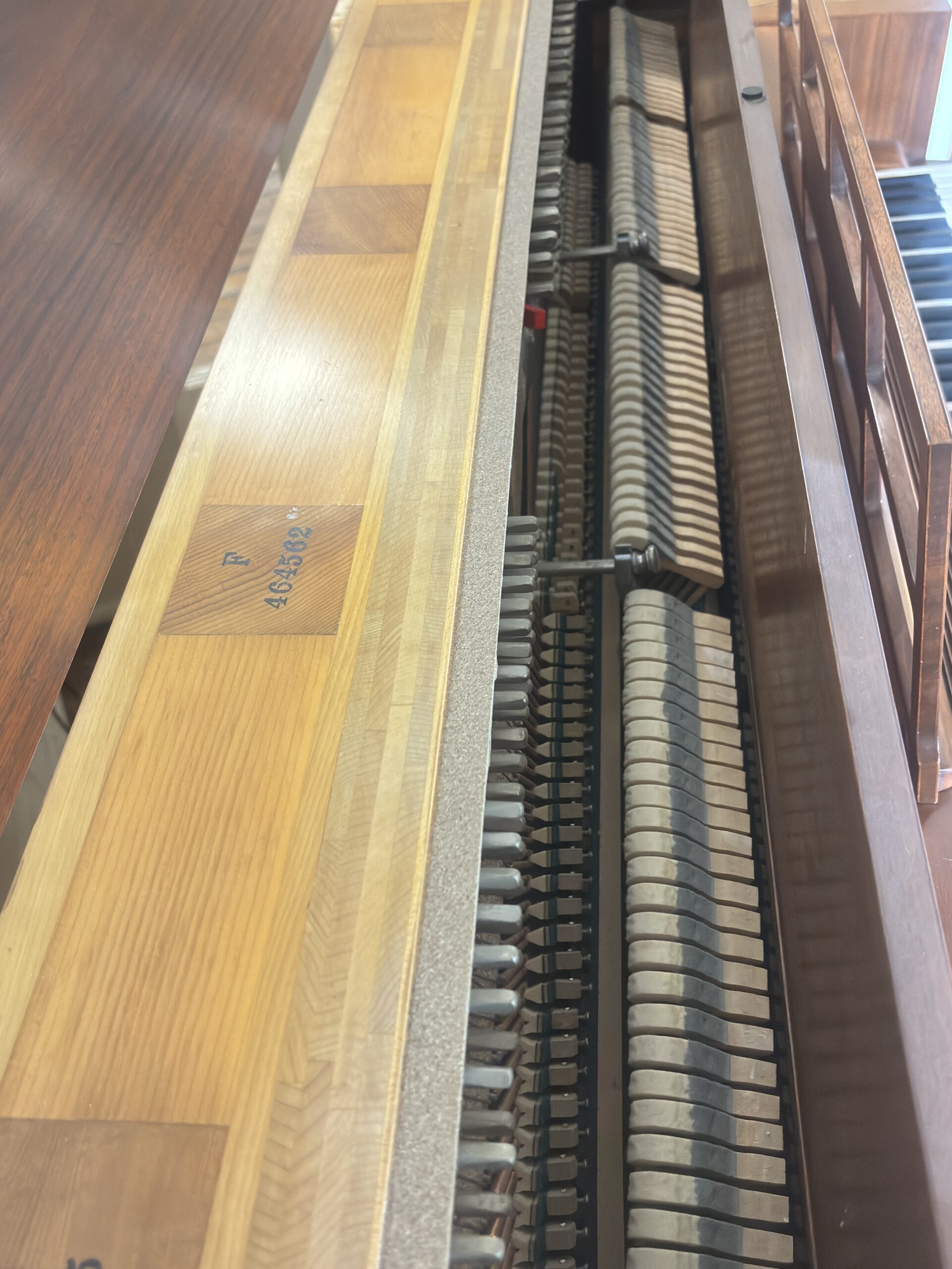 Measuring just under 42″ in height, the Steinway Model F was produced as a mid-sized addition to Steinway & Sons’ line of vertical instruments. At home in professional practice rooms and homes throughout the world, these console-style instruments were the introduction to Steinway for many pianists. We are pleased to offer Steinway & Sons Upright Model F, Serial #464562, for sale in our Providence, RI, showroom.